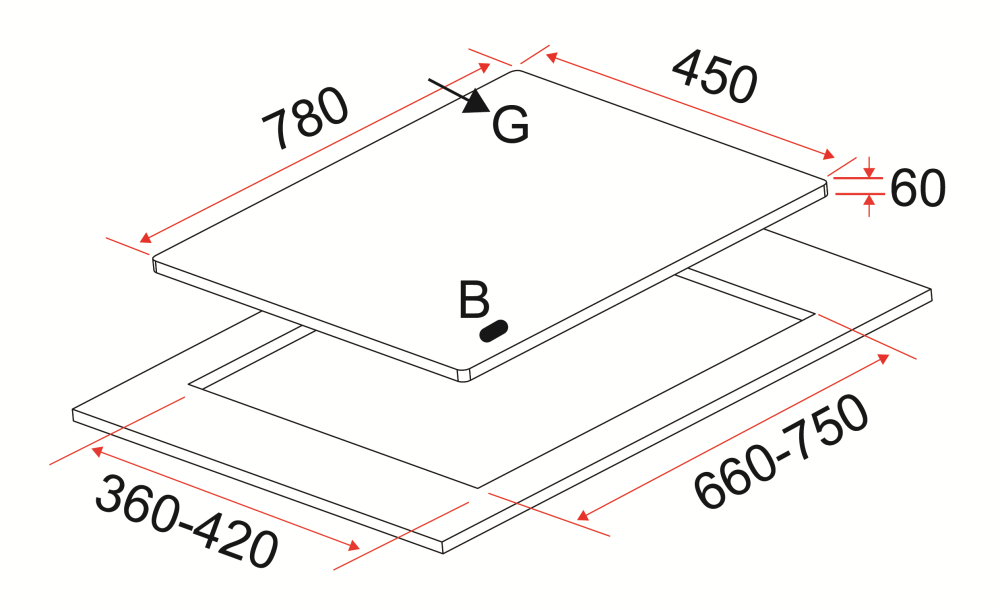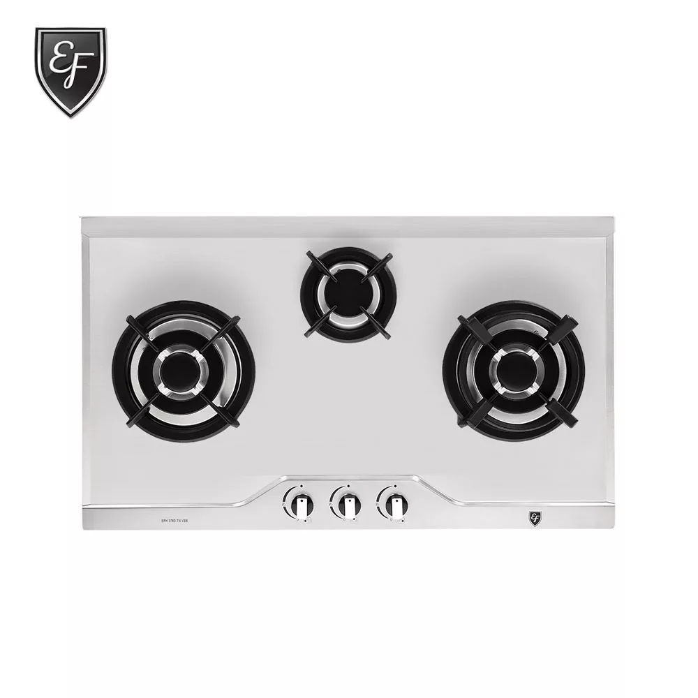 - 3 Burner: Left: Triple Ring Burner – 3.4kW Center: Semi Rapid Burner – 1.75kW Right: Triple Ring Burner – 3.4kW