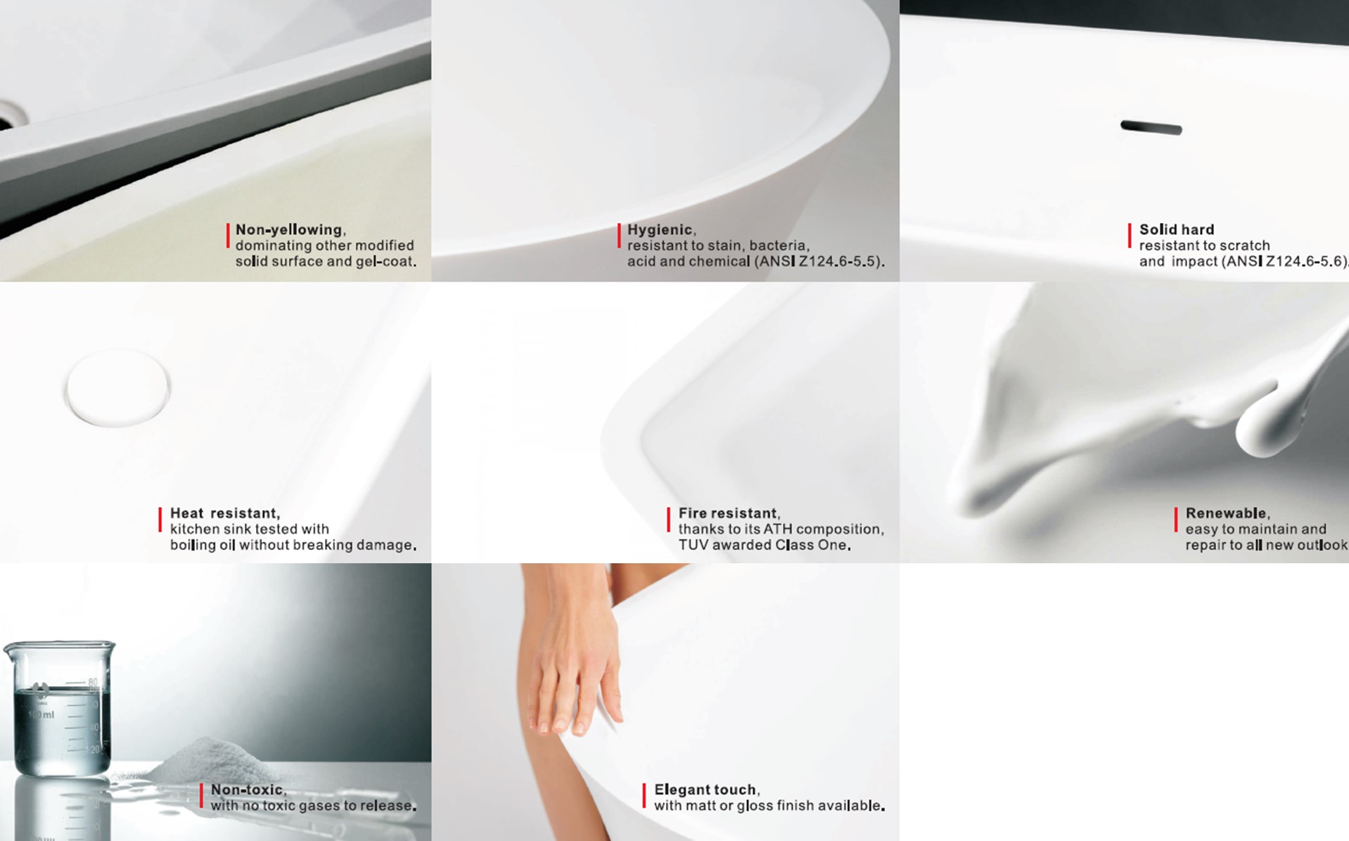 Made of solid surface material, the product is easily cleaned by using mild detergent and abrasive sponge. If damaged by scratches, it is easily repaired by sanding with mild sandpaper