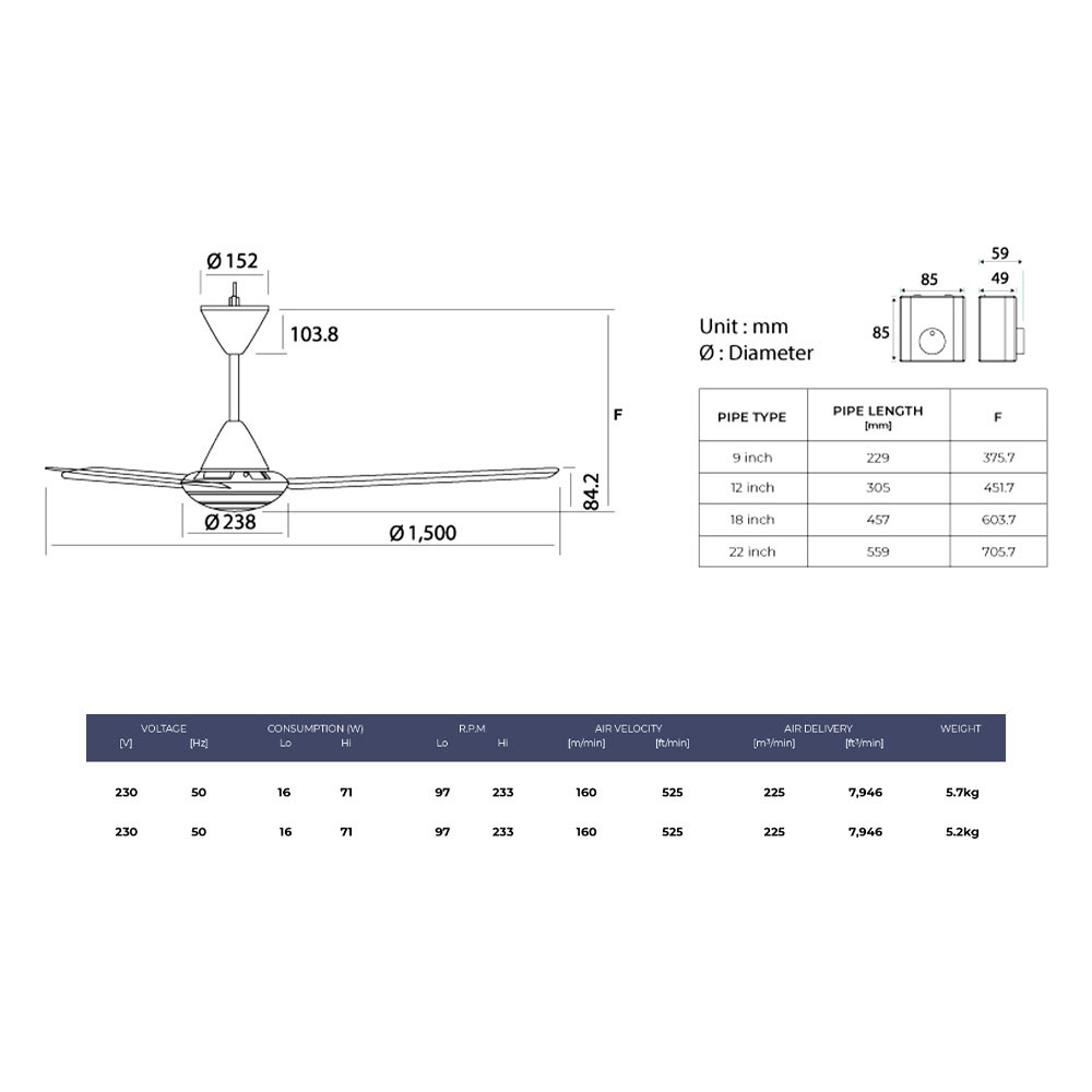 The KDK-M60SG is a 150cm (60-inch) AC ceiling fan designed for bungalows, apartments, and semi-detached homes with high ceilings (3 metres and above). Combining proven reliability with patented safety features, this fan features a 3-blade design optimized for powerful airflow and quiet operation, making it ideal for large living rooms, dining areas, or bedrooms. Its 5-speed regulator control allows precise adjustments to suit your comfort, while the permanently lubricated ball-bearing assembly ensures smooth, maintenance-free performance
