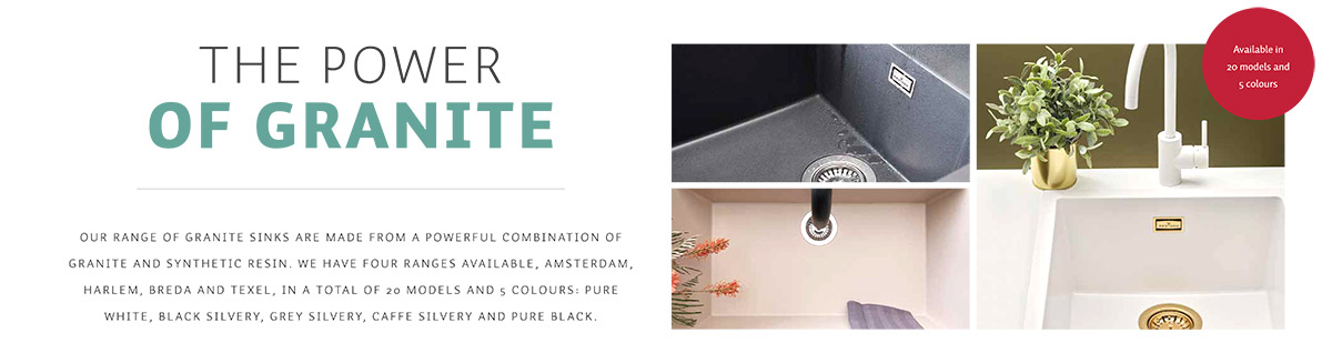 Our range of granite sinks are made from a powerful combination of granite and synthetic resin. We have four range available, Amsterdam, Harlem, Breda and Texel. In a total of 20 models and 5 colours: Pure White, Black Silvery, Grey Silvery, Caffe Silvery and Pure Black
